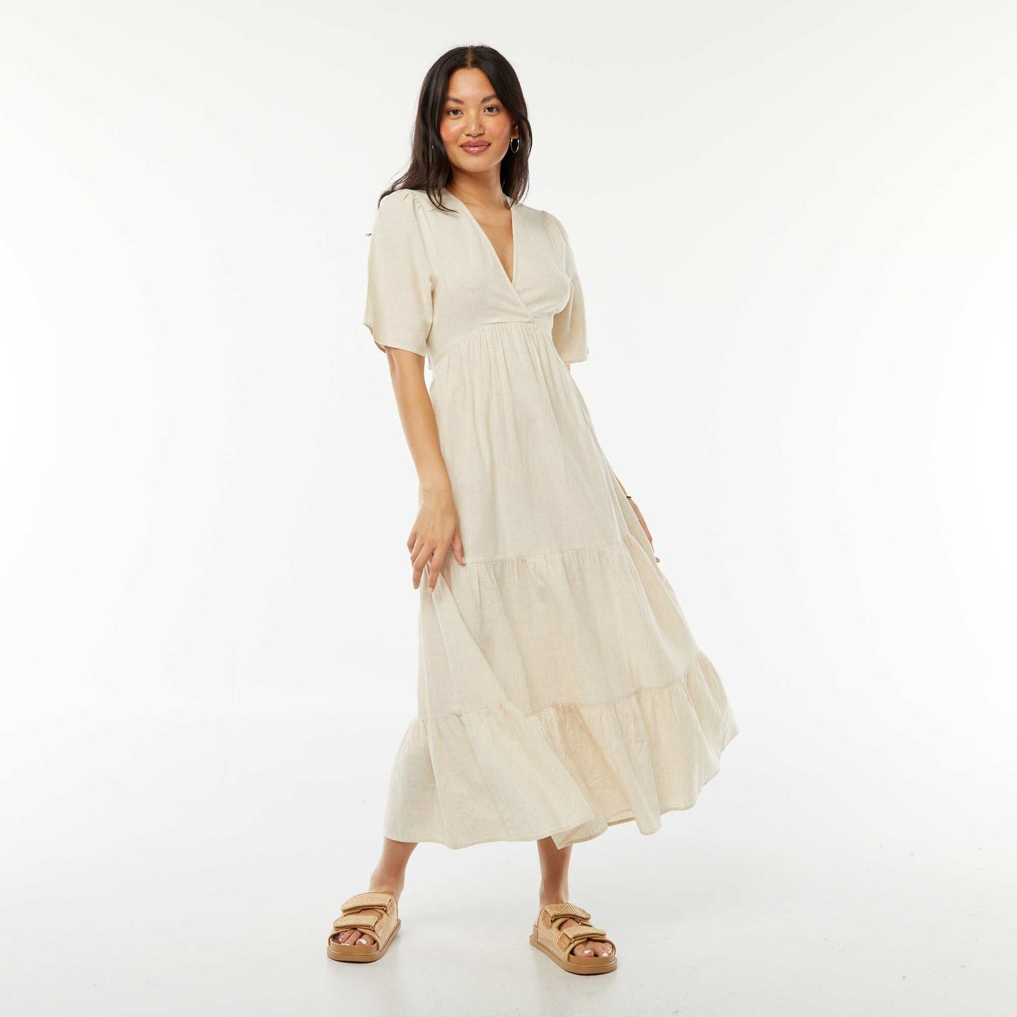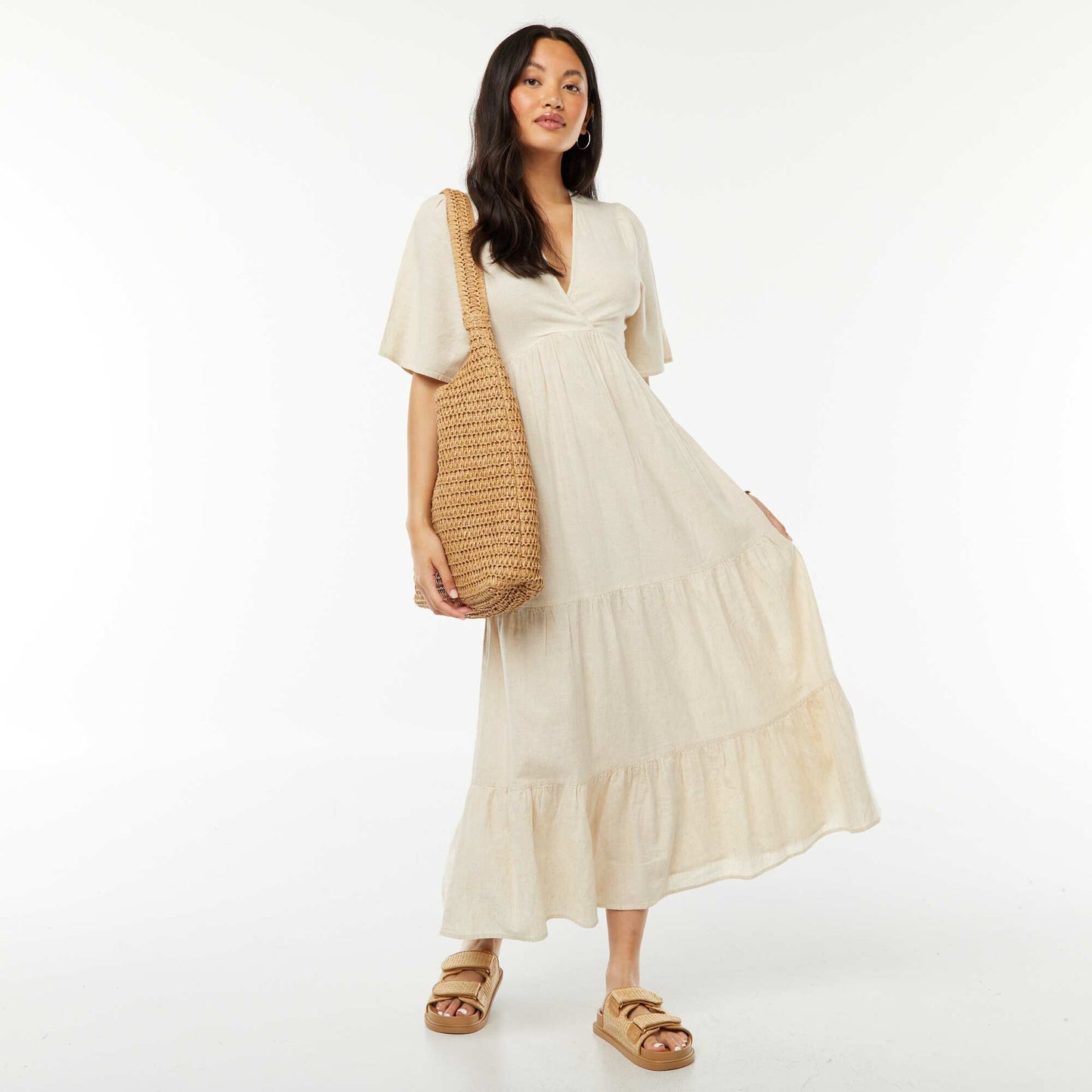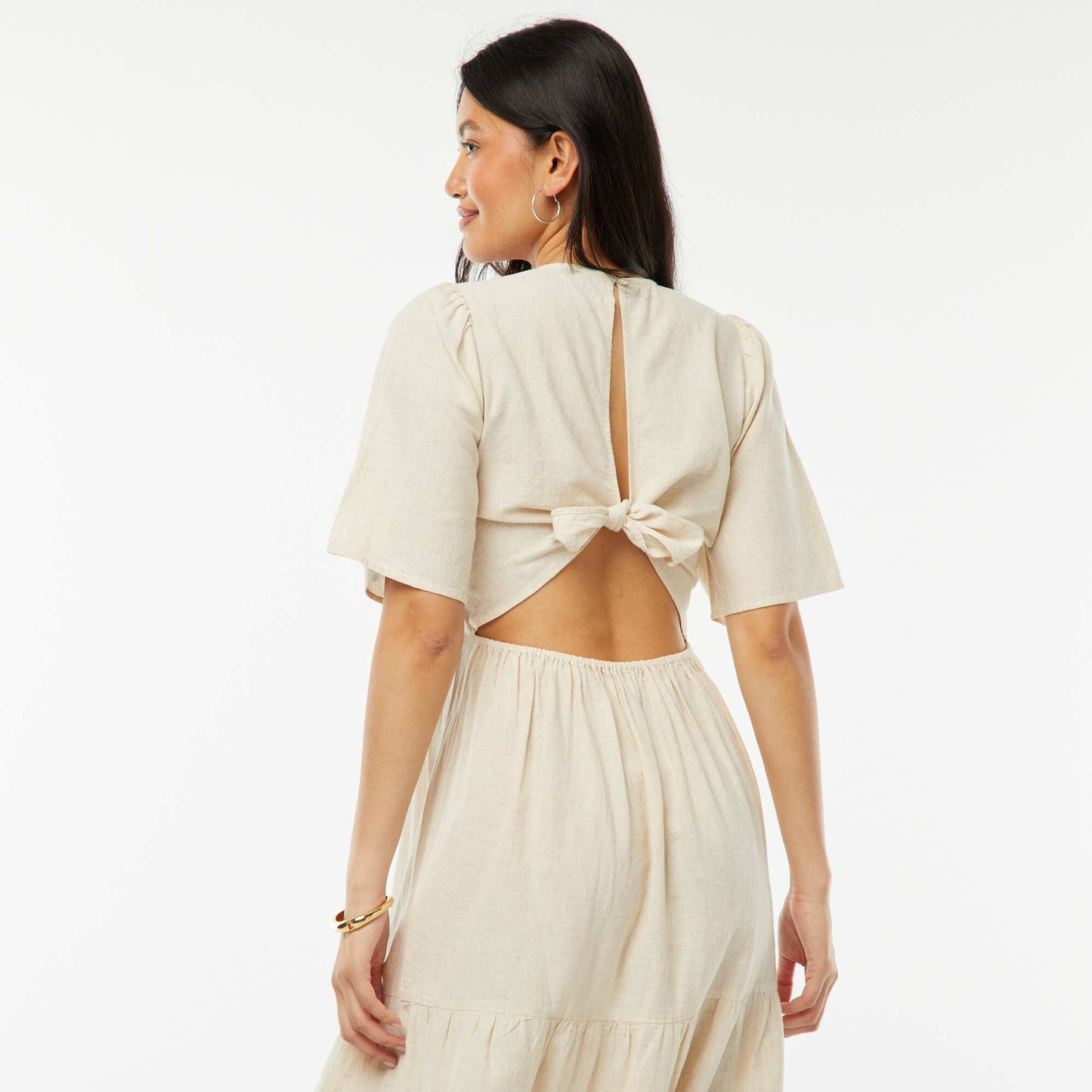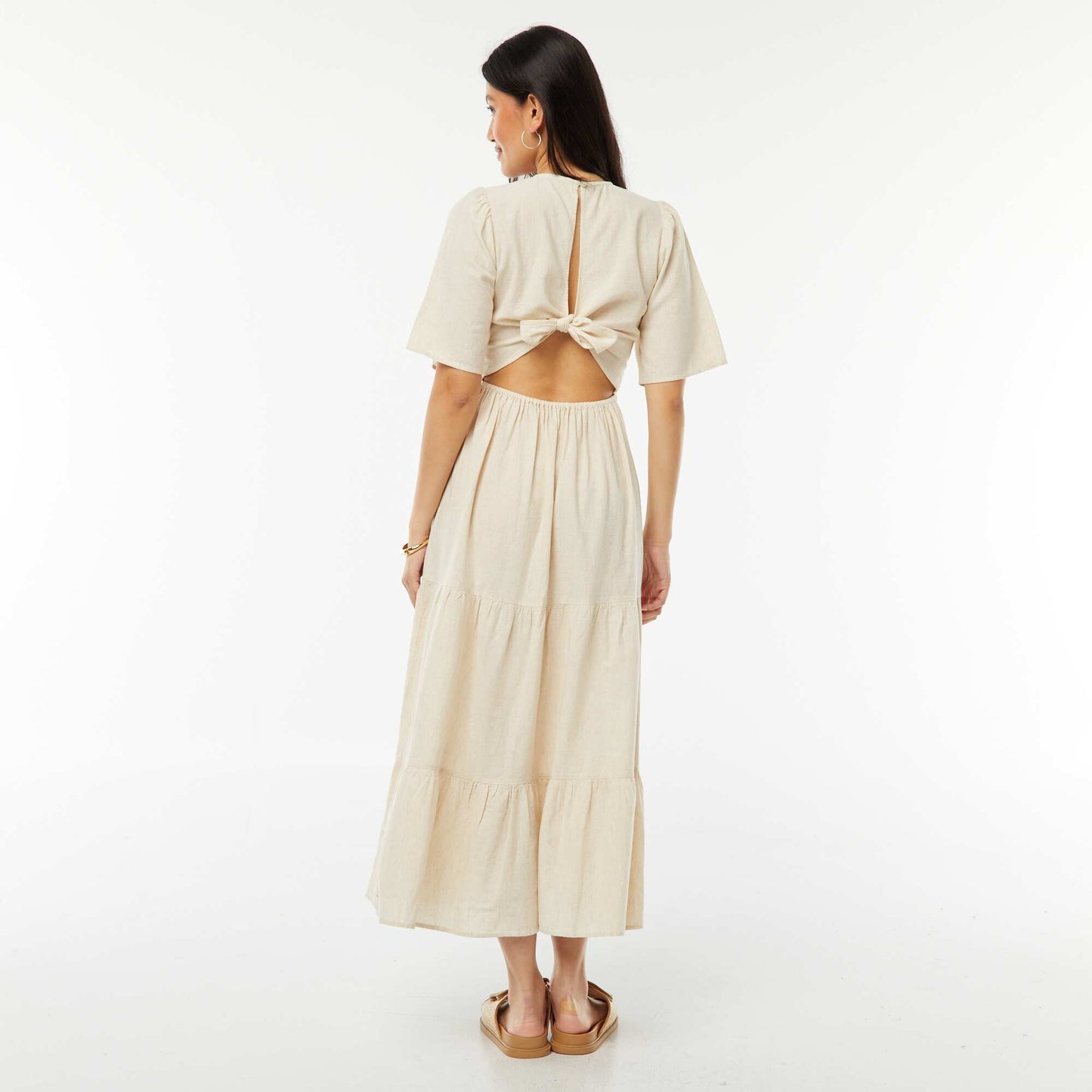 გრძელი კაბა ფლაუნსებით დაბოლოების და შიშველი ზურგით კრემისფერი